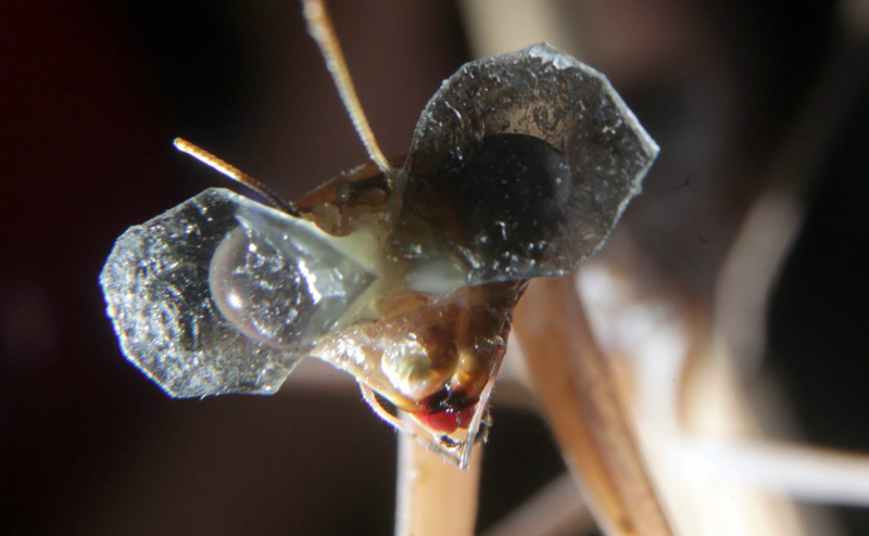 Scientists put these tiny 3D glasses on praying mantises to test their vision. Image Credit: Newcastle University