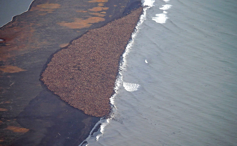 This picture, from September, shows 35,000 walruses clustered on an Alaskan shore. Many researchers say the loss of sea ice means these animals can no longer spread out as they’re accustomed to. Image Credit: Corey Accardo / NASA