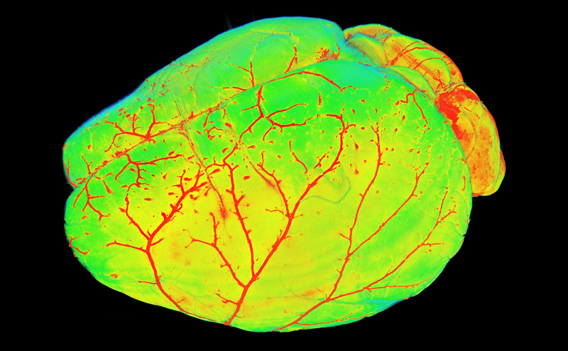 A mouse brain with the neurovasculature traced in red. Image Credit: Ali Erturk / Nikon Small World