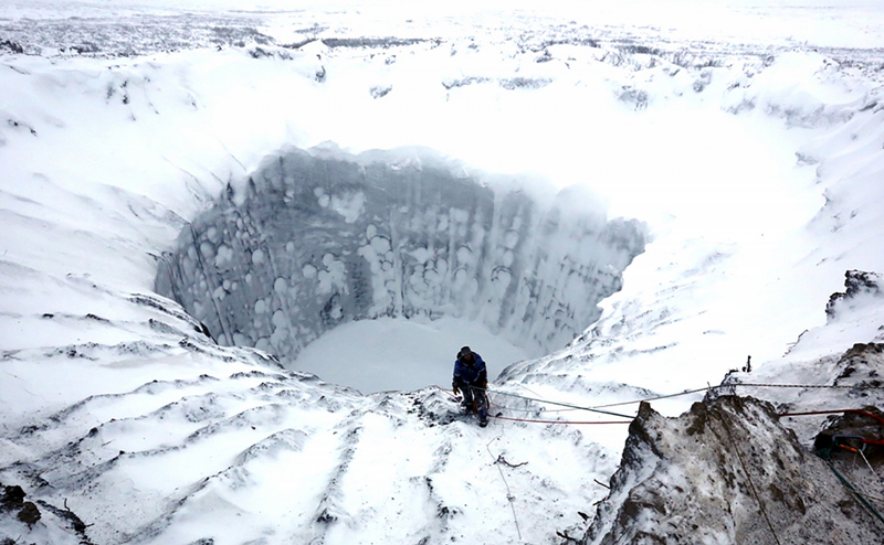 After large, mysterious holes popped up throughout Siberia this year, Russian scientists were sent to investigate. One of the earliest theories behind the craters was that thawing permafrost is behind the phenomenon, but it’s still too soon to say for sure. Image Credit: Vladimir Pushkarev/Russian Centre of Arctic Exploration