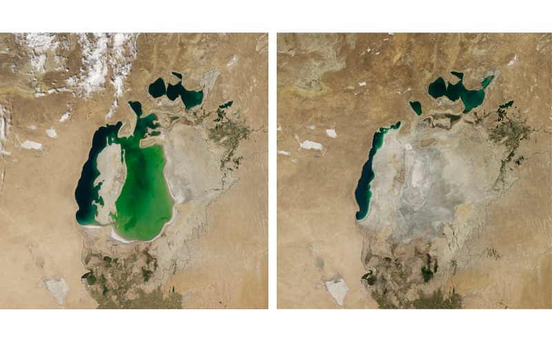 The Aral Sea in Kazakhstan in 2000, on the left, and 2014, on the right. Irrigation and dry seasons have nearly drained the sea. Image Credit: NASA Earth Observatory