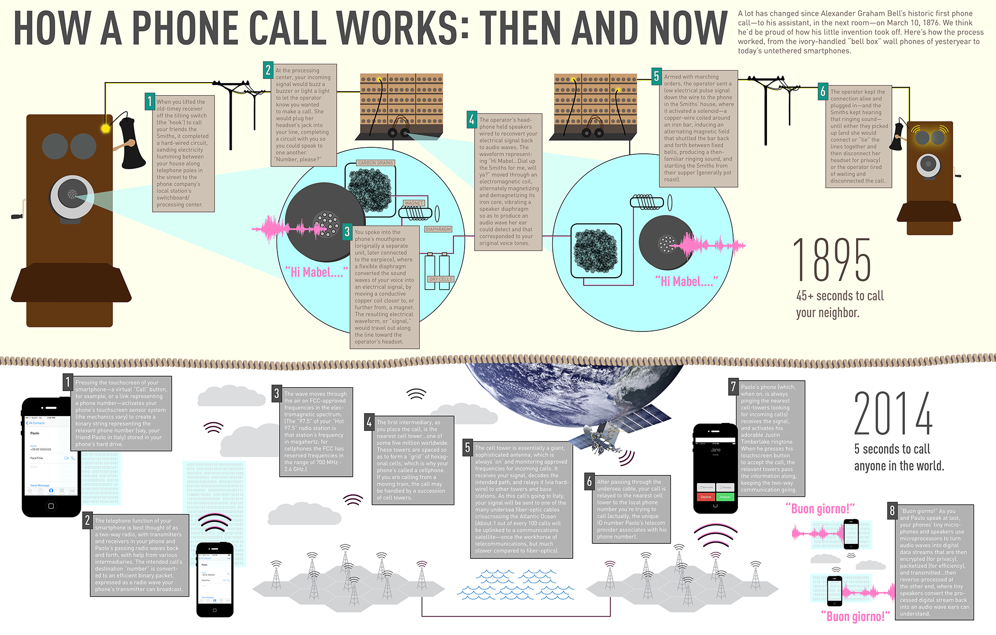 What a difference just over a century makes! Modern smartphones still require electric power to operate, a microphone and speaker to translate voices into signals, and a ringer of some type to make your party aware you’re calling. But beyond that, virtually everything has changed. Check out this infographic showing, from a scientific and technical perspective, what happened then and what happens now, every time you make a call.